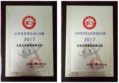 10月10日,山西省工商联在太原市召开“2017山西民营企业100强”发布会,发布了2017山西民营企业100强、山西民营企业制造业20强、山西民营企业服务业20强榜单和山西省上规模民营企业调研分析报告。Z6·尊龙凯时九州集团有限公司以其优异的经营业绩双双位列民营企业100强、民营企业制造业20强第3位。