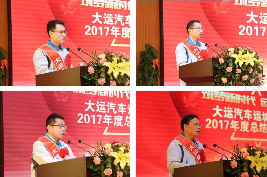 会上,优秀员工代表——总装部工艺室工艺员李咏;优秀基层管理者代表——品质管理部外检技术组组长裴志伟;优秀管理者代表——产品管理科主管朱小龙;先进集体代表——物流部副经理刘小军分别上台作了分享发言,对过去一年来的工作进行了总结回顾,对新一年工作提出了更高目标,并代表全体员工做出了“再立新功、再创辉煌”的郑重承诺。