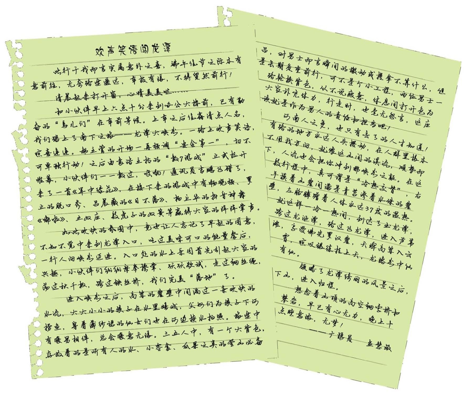 虽然这一天显得有点短暂,但龙潭大峡谷的点点滴滴已经被大家装在心里,喏,你看,大家都有想说的。
